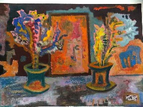 Полотно представляет собой натюрморт, в центре которого размещены две невысокие сине-зелёные вазы с оранжевым орнаментом. Левая ваза украшена жёлтой каймой вверху и внизу и содержит крупный букет из синих, розовых, жёлтых, бледно-зелёных и коричневых растений. В правой вазе, с жёлтой каймой внизу и оранжевой вверху, находятся ветки с жёлто-зелёными, розово-оранжевыми и лиловыми оттенками. Композиция развёрнута на серо-голубой плоскости с синими и коричневыми пятнами. На заднем плане расположена чёрная стена с лиловыми, бирюзовыми, голубыми и оранжевыми пятнами, а также тёмно-коричневая рамка, обрамляющая пятнистую оранжевую поверхность. В работе подчёркнута выразительная цветовая гамма и сложная композиция.