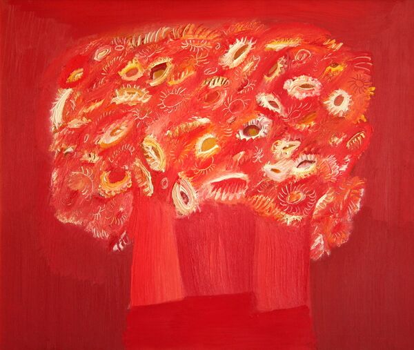В центре полотна расположены два красных букета, форма которых напоминает деревья. Цветы изображены условно, с использованием декоративных приёмов. В структуре букетов выделяются отдельные пятна жёлто-зелёного, оранжевого и белого цветов. Фон выполнен в тёмно-красных тонах, а вся композиция выдержана в преобладающей красной цветовой гамме.