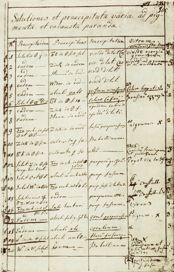 Множество разнообразно окрашенных стёкол было получено М. В. Ломоносовым при весьма ограниченном наборе элементов, использовавшихся в качестве включений, влиявших на цветность (ныне применяющиеся с этой целью хром, уран, селен, кадмий, попросту ещё не были открыты в то время) — очень искусно варьируя приёмы химической обработки в восстановительных и окислительных условиях при изменении состава стекла за счёт введения свинца, олова, сурьмы и некоторых других веществ.