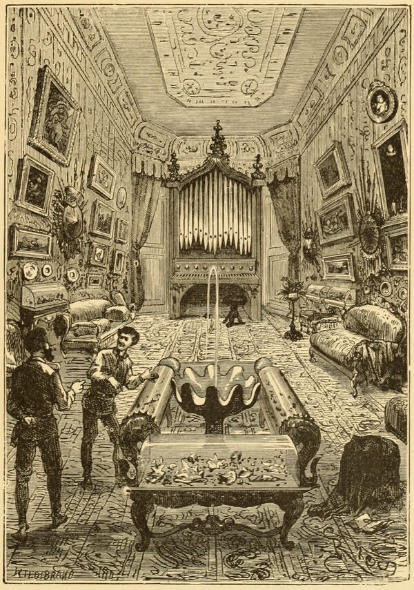 Всю стену между дверьми в сторону носа подводной лодки занимает орган или (в зависимости от перевода[15]) — огромная фисгармония, на которой разбросаны партитуры Вебера, Россини, Моцарта, Бетховена, Гайдна, Мейербера, Герольда, Вагнера, Обера, Гуно и многих других (вместе с тем, ширина клавиатуры музыкального инструмента не может превышать двух метров, иначе на ней невозможно играть).