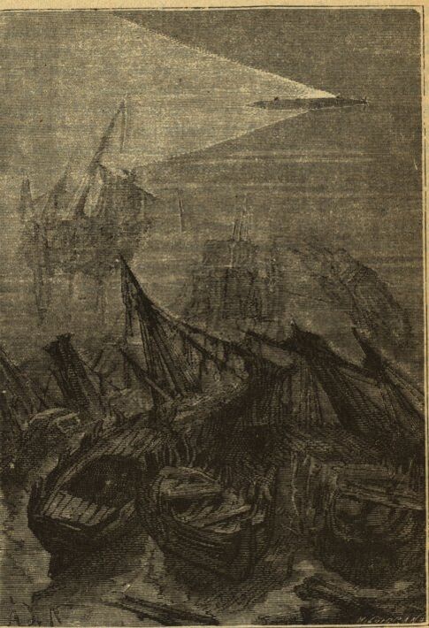 В главе XIII романа «Двадцать тысяч льё под водой» на вопрос профессора Аронакса о столкновении двух кораблей капитан Немо поясняет: