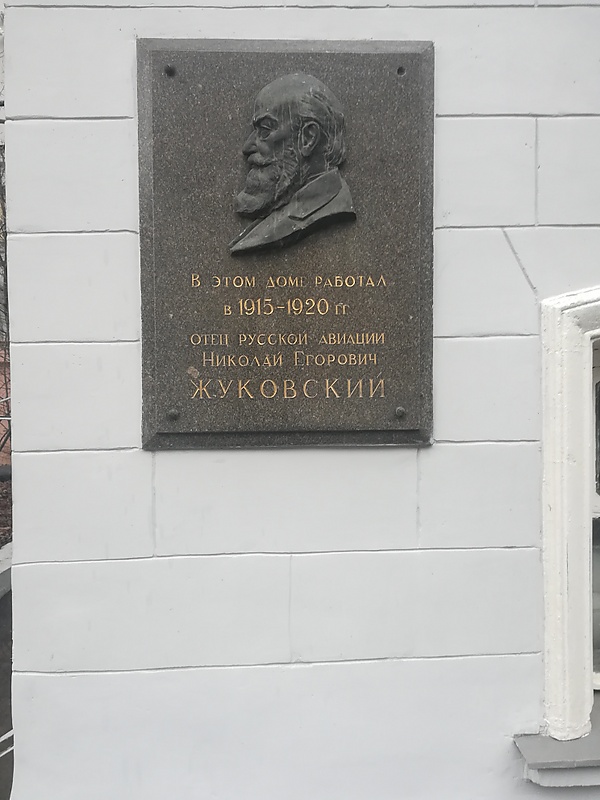 «В этом доме работал в 1915—1920 гг. отец русской авиации Николай Егорович Жуковский»