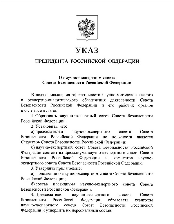 Президиум Научно-экспертного совета утверждается президентом России по предложению секретаря Совбеза.
