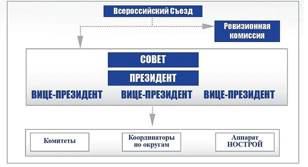 Высшим органом управления является Всероссийский съезд саморегулируемых организаций, который по Уставу НОСТРОЙ созывается не реже одного раза в год. Президент Национального объединения строителей является единоличным исполнительным органом и избирается Съездом тайным голосованием сроком на четыре года.
