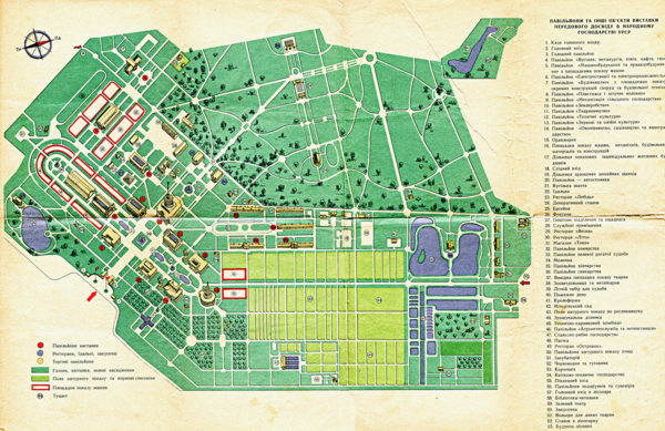 Тогда в состав выставки входили такие павильоны: Главный, «Машиностроение и приборостроение», «Угольная, нефтегазовая и металлургическая промышленность», «Энергетика и электрификация», «Строительство и промышленность строительных материалов», «Пластмассы и полимерные материалы», «Земледелие», «Зерновые и масляные культуры», «Технические культуры», «Животноводство», «Овощеводство, садоводство и виноградарство», а также павильоны натурного показа животноводства. Позже были построены павильоны «Угольная промышленность» с макетом действующей шахты, «Периодические выставки», «Механизация и электрификация сельского хозяйства», «Товары народного потребления», «Богатства моря», организованы павильоны «Народное образование» и «Наглядная агитация».
