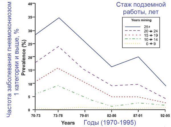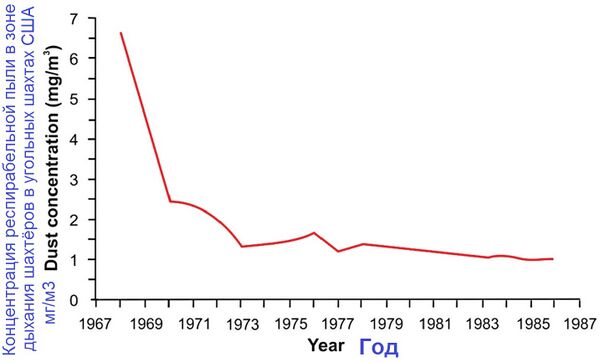 После создания института его специалисты самостоятельно и вместе со специалистами из других организаций проводили работы в области профилактики профзаболеваний шахтёров. В частности, систематизировав результаты всех доступных американских и иностранных исследований, Институт подготовил обзор[22], в котором рекомендовал установить ограничения предельно-допустимой концентрации респирабельной (мелкодисперсной) пыли: угольной (без кварца) 1 мг/м3, и кварцевой 0.05 мг/м3. (Доля респирабельной, мелкодисперсной пыли, которая при вдыхании проникает глубоко в органы дыхания, и оседает в альвеолах (размер частиц ~ мtнее 5 мкм) составляет 5 — 20 % от всей пыли по массе[23]. Таким образом эти ограничения примерно соответствуют концентрации всей пыли по массе 5 — 20 мг/м3 для угля и 0.25 — 1 мг/м для кварца, что примерно соответствует ПДКрз в СССР и РФ. Однако с учётом технически достижимого уровня запылённости, и других обстоятельств, были установлены ПДКрз 2 и 0.1 мг/м3 соответственно. При выполнении этих ограничений (за счёт жёсткого контроля со стороны государственных инспекторов MSHA профзаболеваемость и смертность стали резко снижаться.