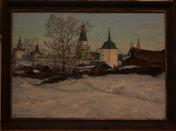 На полотне представлен зимний пейзаж с видом на северо-западную стену и башни, на фоне которых выделяются тёмные, покосившиеся сараи. Эти постройки расположены на переднем плане и резко контрастируют с заснеженным полем, что подчёркивает композиционное построение картины. Цветовая гамма работы основана на сочетании тёмно-коричневых и светло-серо-голубых тонов, усиливающих впечатление зимнего пейзажа.