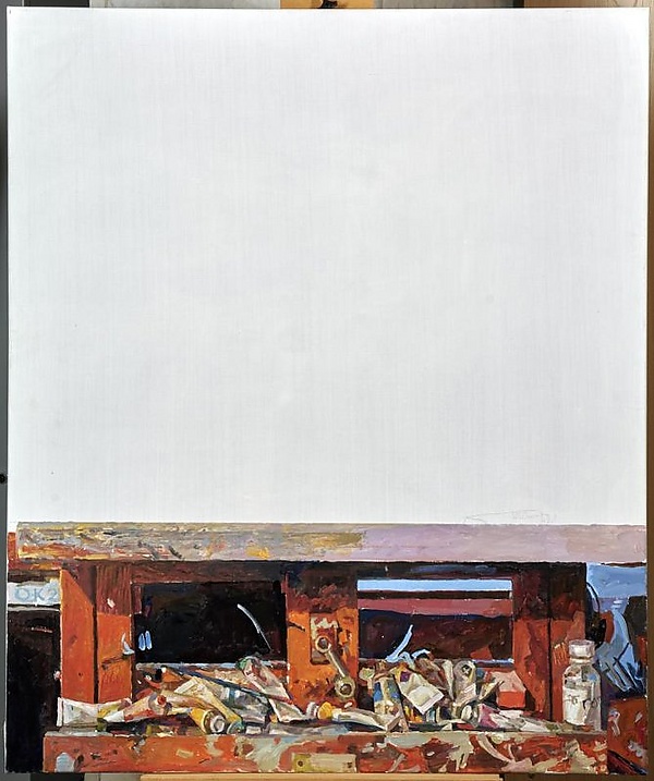 Большую часть композиции занимает изображение белого холста, установленного на мольберте. В нижней части картины показана полка мольберта, на которой размещены тюбики с красками и бутылка с растворителем. Изображённые предметы отражают рабочую обстановку художественной мастерской, что характерно для жанра натюрморт.