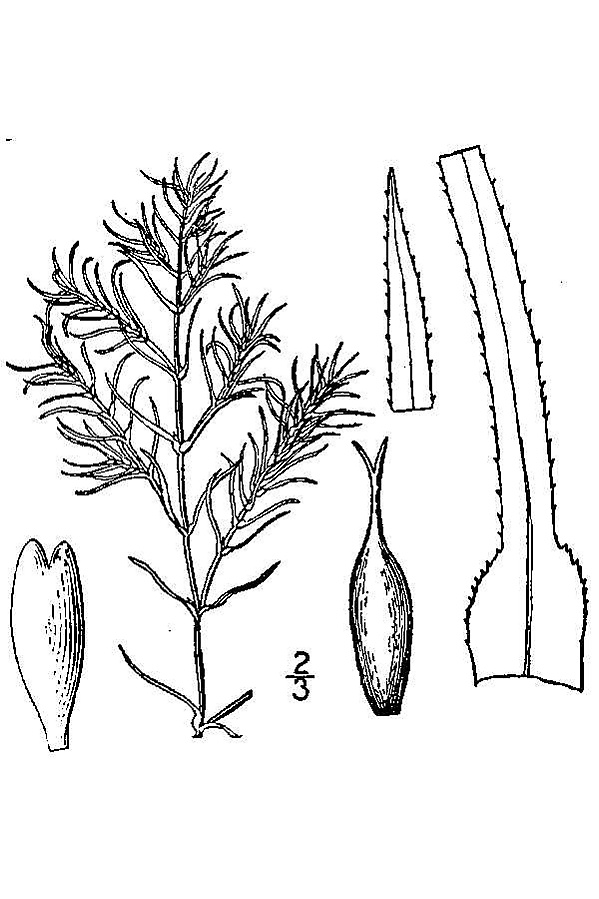 Листья линейные, обычно светло-зелёные, 1—3 см длиной и 0,4—1,2 мм шириной, гибкие, с мелкими зубчиками по краям, постепенно переходящие в зубчатое влагалище; влагалища постепенно переходят в пластинку; стебель и средняя жилка листьев без шипиков.