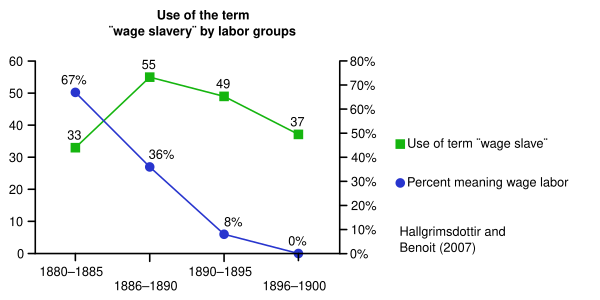 Оригинальный текст (англ.)[показатьскрыть]increased centralization of production… declining wages… [an] expanding… labor pool… intensifying competition, and… [t]he loss of competence and independence experienced by skilled labor meant that "a critique that referred to all [wage] work as slavery and avoided demands for wage concessions in favor of supporting the creation of the producerist republic (by diverting strike funds towards funding… co-operatives, for example) was far less compelling than one that identified the specific conditions of slavery as low wages…"