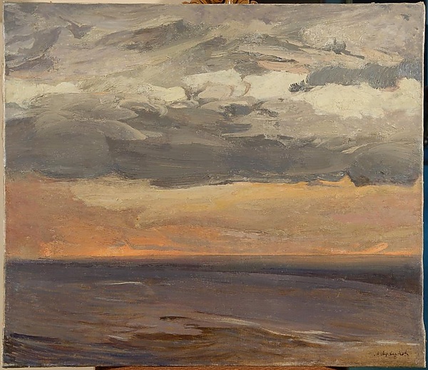 Композиция картины построена таким образом, что основное пространство занимает изображение закатного неба, покрытого кучевыми облаками. В нижней части полотна представлена узкая полоса спокойного моря, что подчёркивает принадлежность работы к жанру марины. В цветовой гамме преобладают оттенки серого, серо-фиолетового, оранжевого и белого, что способствует созданию выразительной атмосферы закатного времени суток.