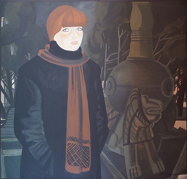 На картине изображена рыжеволосая веснушчатая девушка с густой челкой, повернутая в три четверти вправо. Она одета в черное пальто, руки спрятаны в карманы, а спереди виден клетчатый рыжий шарф. Справа от фигуры располагается круглое основание фонаря, поддерживаемое тремя каменными львами. Слева за спиной девушки заметен фрагмент скамейки. Работа выполнена в жанре портрета.