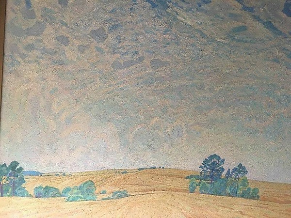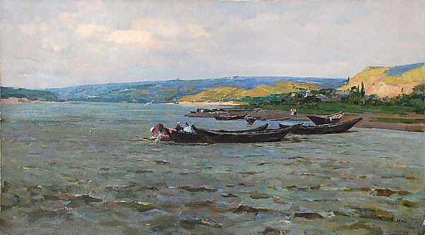 На переднем плане картины изображена водная гладь с волнами, выполненная в серо-голубых и зелёных тонах. Во втором плане, на отмели у серо-сиреневого с зеленью мыса, размещены чёрные лодки. В центральной лодке находятся две сидящих фигуры, а рядом женщина в сиреневой блузке занята стиркой белья. На мысу изображено стадо коров и две ярко одетые фигуры. Третий план занимает группа построек, скрытых за зеленью, позади которых простираются зелёно-жёлтые холмы и возвышенный берег, уходящий вдаль. Слева виден участок пологого берега. Небо представлено в розово-голубых облачных оттенках. Композиция и подбор цветовой гаммы подчёркивают идиллическую атмосферу пасторального пейзажа, передавая гармонию природы и сельского быта.