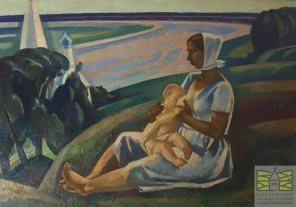 На полотне представлена сцена из бытовой жизни: сидящая мать, кормящая младенца у груди. Действие происходит на фоне летнего пейзажа, что придаёт композиции атмосферу уюта и естественности.
