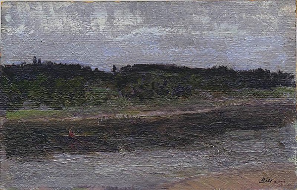 На полотне изображена спокойная река, по левому краю которой находится лодка с двумя гребцами. На противоположном берегу виднеется густой лес. Небо выполнено в серо-сиреневато-голубоватых оттенках, что подчёркивает умиротворённую атмосферу пейзажа и гармонию между природой и человеком. Особенности цветовой гаммы и построения композиции способствуют созданию ощущения покоя и созерцательности.