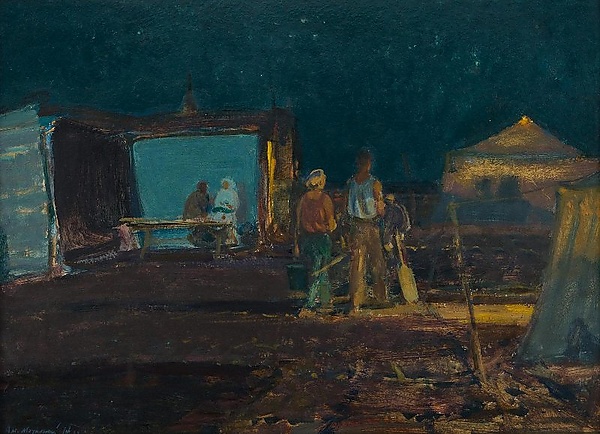 На картине изображён вечерний лагерь целинников: справа размещаются две освещённые палатки, слева — два выкрашенных в голубой цвет вагончика. Возле одного из вагончиков на лавке сидят две женщины, одна из них в белом. На среднем плане представлены идущие спиной к зрителю девушка в зелёных брюках и красной майке с ведром и мужчина с лопатой. В работе использована характерная зеленовато-синяя цветовая гамма, подчёркивающая вечернее освещение.