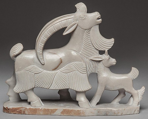 Скульптура представляет две фигуры: козу и козлёнка, установленные на невысокой подставке неправильной формы. Фигуры обращены друг к другу и сращены в области гривы. Голова козы изображена с крупными изогнутыми рогами, на которых присутствует орнамент из прямых линий. На морде прорезаны глаза, ноздри, рот полуоткрыт. Выразительные, вытянутые уши и длинная выгнутая борода подчёркивают индивидуальные черты фигуры. Шерсть на груди и по низу туловища передана с помощью параллельных линий. Небольшой пышный хвост изображён поднятым вверх. Фигура козлёнка вплотную примыкает к фигуре козы в области шеи. Голова козлёнка повёрнута назад и венчается небольшими прямыми рожками, а длинные вытянутые уши дополняют образ. Детали морды прорезаны, что позволяет различить черты лица. Дополнительно к изображению животных на левой задней ноге козлёнка присутствует растительный мотив в виде пучка травы. Скульптура вырезана из светлого камня коричневого цвета с рыжими вкраплениями. Размеры объекта составляют: высота — 12 см, длина — 15,2 см, ширина — 4,1 см.