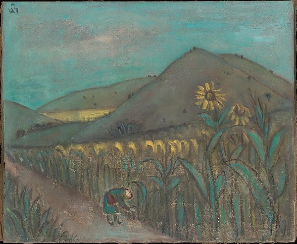 На картине изображён холмистый пейзаж с полем подсолнухов на первом плане и проходящей по нему дорогой. На дороге стоит женщина, наклонившаяся к цветам, что придаёт сцене живую и непосредственную атмосферу.
