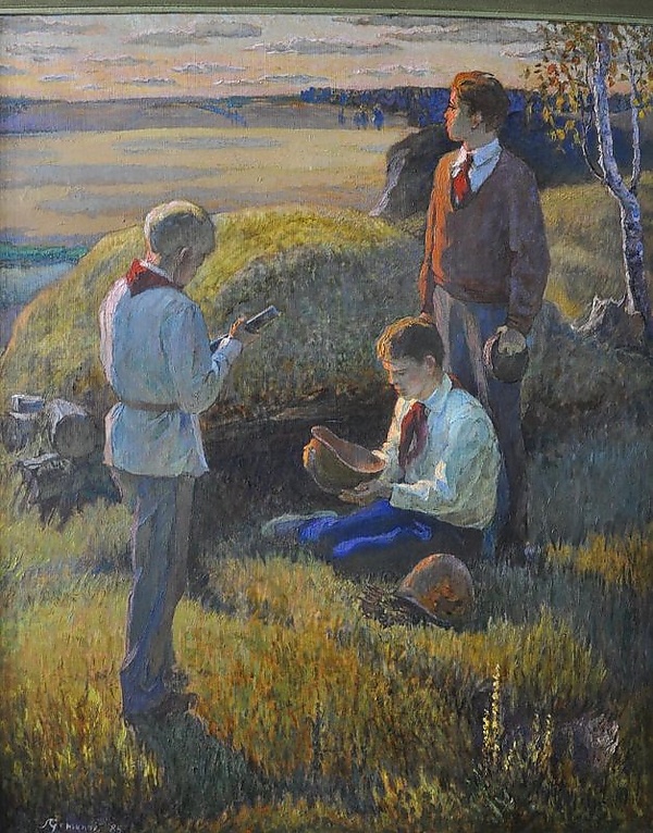 На переднем плане изображены три участника пионерского движения, находящиеся на невысоком холме, покрытом травой, в летний день. Слева пионер, одетый в белую рубашку и серые брюки, стоит спиной к зрителю и держит в руках ствол автомата. В центре другой пионер в белой рубашке и синих брюках сидит на траве, держа каску в руках, рядом на траве лежит ещё одна каска. Третий пионер у берёзы держит диск автомата, он одет в белую рубашку и чёрные брюки. Фон составляют уходящие вдаль поля, густой лес по правому краю и небо, покрытое облаками, что подчёркивает характерную для пейзажа атмосферу летнего дня.