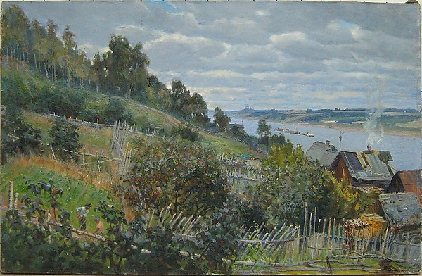 На картине представлен пейзаж летнего пасмурного дня, выполненный в традициях пасторали. На переднем плане трое мальчиков собирают яблоки, что подчёркивает идиллический и сельский характер сцены. На берегу реки изображены дома и огороды, слева возвышается высокий берег, покрытый деревьями и густой растительностью. На противоположном берегу видны поля и едва заметные купола церкви. Композиция строится на противопоставлении насыщенного переднего плана и удалённых деталей, что придаёт изображению глубину и спокойствие.