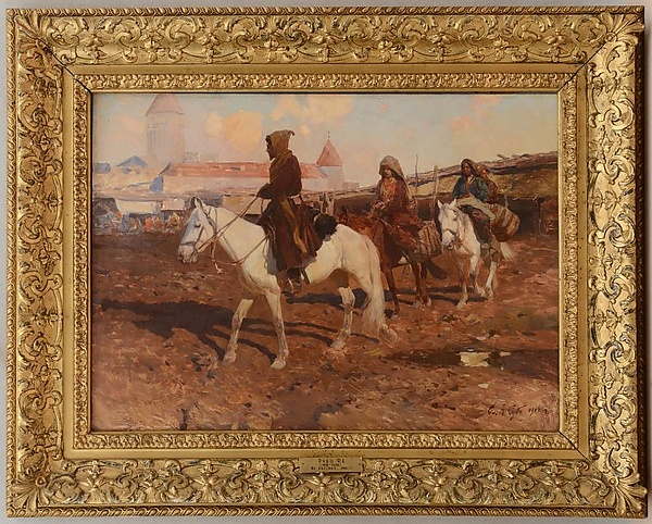 Полотно выполнено в традициях бытового жанра и изображает южный пейзаж в солнечный день. На переднем плане три лошади, идущие друг за другом, первая и третья — светлой масти. На первой лошади находится всадник в коричневом бешмете и жёлтом башлыке, на второй — женщина в национальной одежде с покрытой головой и монисто на груди. На третьей лошади сидят две женщины: одна в синем национальном костюме с покрытой головой, вторая размещается за её спиной, видны только голова и правая рука.