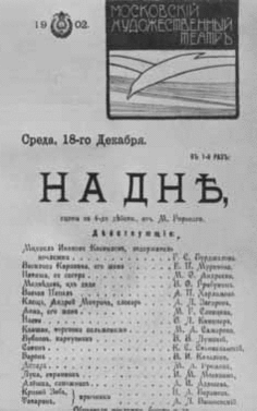 Данные о первой постановке: режиссёры К. С. Станиславский и В. И. Немирович-Данченко, худ. Симов; в ролях: Костылёв — Бурджалов, Василиса — Муратова, Наташа — Андреева, Медведев — Грибунин, Пепел — Харламов, Клещ — Загаров, Анна — Савицкая, Настя — Книппер, Квашня — Самарова, Бубнов — Лужский, Сатин — Станиславский, Актёр — Громов, Барон — Качалов, Лука — Москвин, Алешка — Адашев, Кривой Зоб — Баранов, Татарин — Вишневский).
