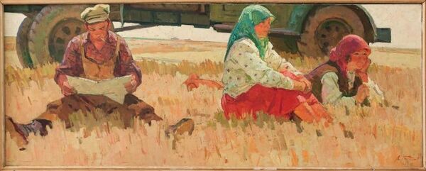 На жёлто-золотистом фоне изображена сцена из повседневной жизни: на земле перед фрагментарно показанным грузовиком сидят мужчина и две женщины. Женщины одеты в яркие наряды и выделяются красной и зелёной косынками. Мужчина читает газету, держа во рту папиросу. Композиция построена таким образом, что внимание зрителя привлекают детали одежды и позы персонажей, а преобладание тёплых оттенков в цветовой гамме подчёркивает атмосферу бытовой сцены.