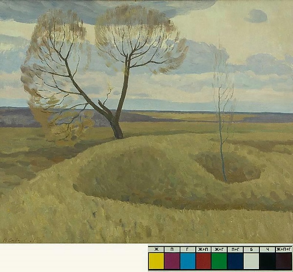 На переднем плане изображена воронка от взрыва, частично заросшая травой и с растущей молодой берёзой, что подчёркивает сочетание следов войны и восстановление природы. В центре композиции расположено старое дерево с обломанными ветвями и окопы, отражающие характерные мотивы батального жанра. Вдали открываются бескрайние поля, создающие ощущение простора и дополняющие ландшафтную составляющую полотна.