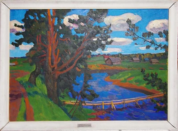 На картине представлен пейзаж с крутыми берегами реки, покрытыми зелёной травой и обрамлёнными с двух сторон: слева расположены две разлапистые сосны, справа видны две сосновые ветки. Между берегами протекает широкая извилистая река, через которую перекинут деревянный мост. На дальнем плане изображены несколько деревянных изб без окон и полоска леса. Верхнюю часть композиции занимает голубое небо с белыми облаками. Для живописи характерна насыщенная цветовая гамма, в которой преобладают синий, зелёный, коричневый и белый цвета; мазок умеренно пастозный.