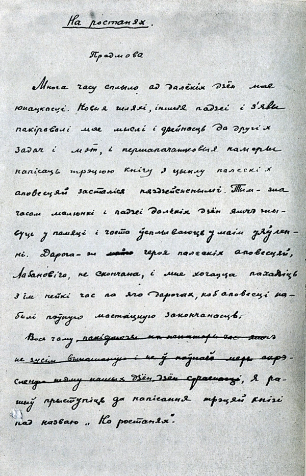 После завершения третьей книги трилогии автор счел необходимым объединить цикл полесских повестей и издать их отдельной книгой под общим названием «На ростанях». Готовя трилогию к печати отдельным изданием (1955), Я. Колас переработал отдельные места и даже целые разделы[3], написал новые, внес в текст многочисленные изменения и поправки. Существенно переработана в идейных и стилистических отношениях третья книга трилогии «На перепутье». В первых двух повестях авторские изменения и правки носят преимущественно стилистически-языковой характер. Окончательно подготовив трилогию к печати, Я. Колос в письме к Евгению Мазалькову от 25/ VII 1955 г. сказал: « Все повести внимательно просмотрены перед сдачей в печать»[2].