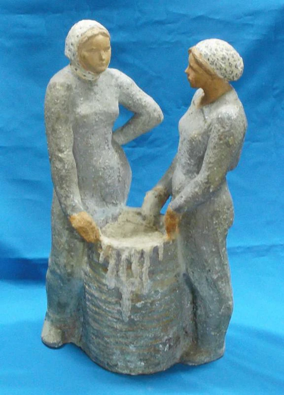 Композиция состоит из двух фигур девушек. Обе фигуры изображены в серых рабочих комбинезонах с белыми платками. Фигуры расположены по разные стороны от серой бочки с подтёками белой краски. Девушка, изображённая слева, опирается левой рукой на край бочки, а правой рукой держится за её бок. Девушка справа держится за край бочки обеими руками. Композиция создаёт ощущение взаимодействия фигур и их окружения.
