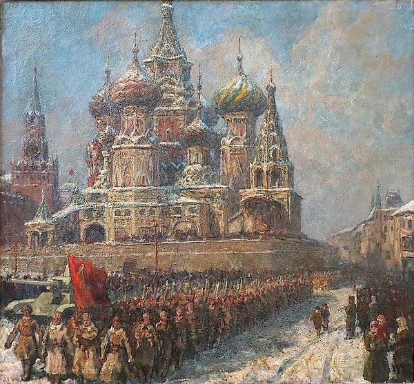 На переднем плане картины изображены идущие колонной по четыре солдаты с красным знаменем, окружённые с обеих сторон многочисленной толпой людей. Слева в композиции расположен зелёный танк, подчёркивающий военную тематику сцены. Фоном служит зимний пейзаж с видом на Красную площадь. Небо написано в голубых и серо-розовых тонах, что создаёт характерную для батального жанра атмосферу и определяет цветовую гамму произведения.