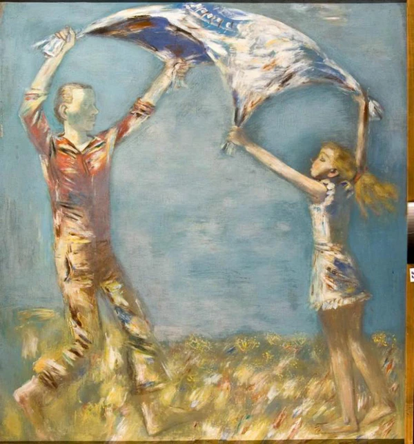 На картине изображены босоногие мужчина и девочка, которые держат за концы платок, поднятый высоко над головой. Действие происходит на фоне синего неба, что подчёркивает атмосферу лёгкости и беззаботности, характерную для бытового жанра.