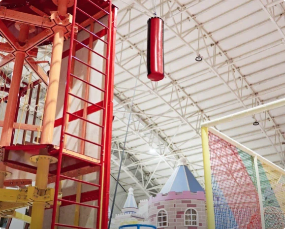 Включает 7 зон препятствий: паутина, мешки, бревно, кольца, туннель, верёвочная лестница.