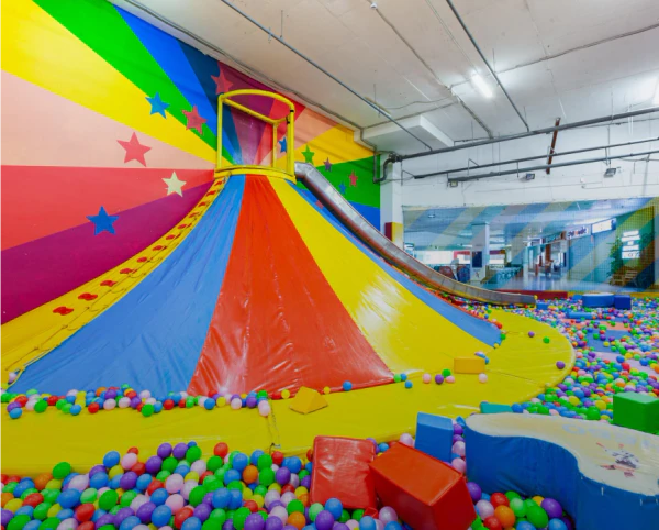 Игровая детская комната для малышей включает 2-этажный лабиринт, вулкан, большой конструктор, горку, бассейн с шариками.