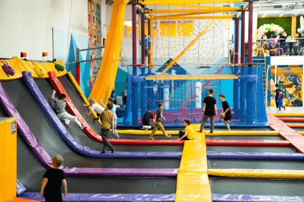 - Батутная арена включает 52 игровых батута, 2 горки и 5 профессиональных батутов.