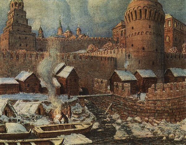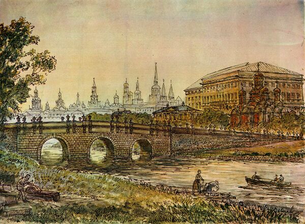 В 1508 году весною великий князь Василий III велел Алевизу Фрязину делать камнем и кирпичом ров вокруг Кремля, а также чинить пруды вокруг града. В 1516 году на Неглинке для этих прудов заложили третью плотину против Ризположенской стрельницы (Троицких ворот) и каменный мост, а ниже по течению были заложены прежде две плотины[10].
