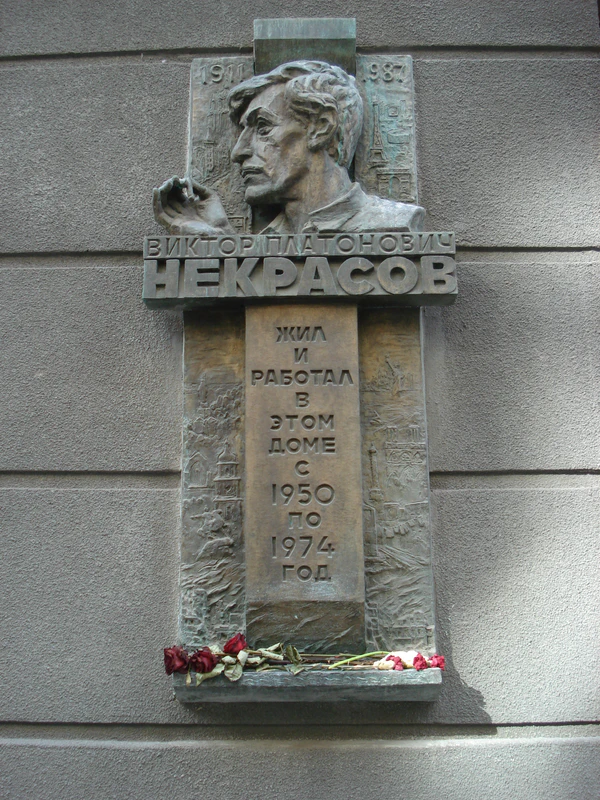- Мемориальная доска на ул. Крещатик, 15[59] (где с 1950 по 1974 год, в квартире № 10 жил Виктор Некрасов). 18 октября 1990 г. у входа в подъезд № 2 (справа) была торжественно открыта мемориальная доска В. П. Некрасову. Скульптор — Валентин Евгеньевич Селибер, архитектор Валерий Александрович Романов[60]