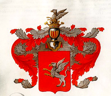Описание герба: Выдержка из Общего гербовника В червлёном поле серебряный гриф, обращенный в правую сторону. Щит увенчан дворянскими шлемом и короной, на поверхности которой виден наполовину выходящий гриф. Намет на щите красный, подложен серебром. |