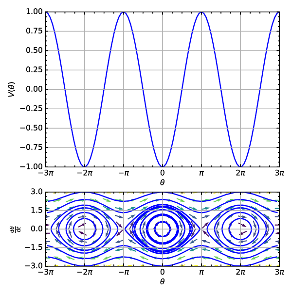 Это соответствует задаче свободного падения. Очень наглядное изображение динамики маятника можно привести, собрав вместе эти примеры линеаризации, как показано на рисунке справа. Существуют другие техники, которые позволяют найти (точные) фазовые портреты и приближенные периоды колебания.
