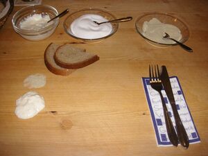 Немецкие сливки чётко подразделяются на «кофейные» (нем. Kaffeesahne, жирностью до 10 %), «для взбивания» (нем. Schlagsahne, от 30 % жирности), которыми начиняют или украшают торты, пирожные и кремовые десерты, а также сдабривают горячие блюда, и «цельные» (нем. Vollrahm, от 45 % жирности), которые точно не свернутся от кислоты и жара и подходят для приготовления соусов[126]. У сметаны по-немецки тоже разные названия в зависимости от жирности: при 10—20 % это «кислые сливки» (нем. saure Sahne), которые годятся для салатных заправок, а свыше 20 % — это уже «шманд» (нем. Schmand), в котором ложка стоит, но с более мягким вкусом, чем французский аналог крем-фреш[127].