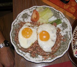 Немцы любят блюда из рубленого мяса и едят даже свежий сырой фарш — не только говяжий по-татарски, но и свиной по-немецки — «метт» или «ха́кепетер» (нем. Hackepeter — букв. «рубленый Петер»), на хлебе, как бутерброд[58]. Метт едят на завтрак или подают на закуску на семейных и корпоративных вечеринках сервированным с репчатым луком и маринованными огурцами[59][60]. Булочку мажут сначала сливочным маслом, затем меттом, сверху кладут перья репчатого лука[61]. В 1950—1970-е годы было модно оформлять сырой фарш для бутербродов на блюде горкой в виде ёжика с иголками из репчатого лука. Под разными региональными названиями (флайшпфланцерль — в Баварии, флайшкюхле — в Швабии, флайшкюхла — во Франконии, фрикадельки — на севере Германии и булетты — в Берлине) немцы жарят свиные и говяжьи рубленые котлеты и биточки. В знаменитом блюде восточнопрусской кухни — кёнигсбергских клопсах, отварных тефтелях под соусом с каперсами, в мясной фарш добавляют рубленое филе сардин. Экономное рубленое жаркое под названием «фальшивый заяц» фаршируют сваренным вкрутую яйцом[62], а раньше запекали в жаровнях для зайчатины, напоминающих по форме тушку зайца[63]. В Аугсбурге тщательно измельчённый пикантный колбасный фарш заворачивают в блины, такой запечённый «фаршевый штрудель»[64] подают с листовым салатом[65] либо нарезают ломтиками в качестве начинки в прозрачный суп[66][67]. Голубцы в Германии заворачивают в бланшированные листья белокочанной или савойской капусты[68], для начинки в фарш обычно добавляют вместо риса размоченную белую булку или панировочные сухари[69][70][71]. В Эшвеге есть собственный вариант голубцов — «капустная головка», которую выкладывают слоями из капусты и фарша в кольцевую форму для ромовой бабы и готовят на пару[72].