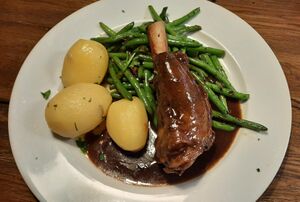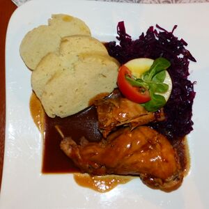 Калорийные мясные блюда из касселера — выдержанной, как колбаса, в нитритной соли и слегка подкопчённой свинины — были привычны послевоенному поколению немцев и сейчас сохраняются в качестве ретротренда[36]. Касселер с квашеной капустой и шпигом был любимым блюдом лидера ГДР Эриха Хонеккера[37]. Мясные остатки с воскресного обеда экономно доедали в понедельник с жареным картофелем. Самый бюджетный вариант воскресного обеда — жареная курица. Бройлер, перед жаркой смазанный смесью растительного масла с солью, перцем и паприкой[38], стал украшением кухни ГДР[39][40], первые рестораны «Золотой бройлер» (нем. Goldbroiler) по образцу западногерманских Wienerwald открылись в Восточном Берлине в ноябре 1967 года[41]. Потребление мяса птицы на душу населения в Германии составило в 2020 году 22,3 кг, что на 17 % выше, чем в 2010 году[42]. Ещё 40 лет назад индюшатина в Германии была экзотикой, ныне немцы потребляют в среднем 6 кг мяса индейки в год[43][44]. Согласно статистическим данным, немцы съедают в среднем около 300 г гусятины в год. Жареный гусь, фаршированный яблоками, каштанами, луком или черносливом, — одно из немногих строго сезонных блюд в Германии, он появляется на столах в течение шести недель между Днём святого Мартина и Рождеством в виде мартинских и рождественских гусей. Только каждый седьмой продаваемый в Германии гусь — местного производства, в 2018 году Германия импортировала из Польши и Венгрии 25 500 тонн гусей и гусиного мяса[45]. Зимним блюдом считается и начинённая замоченной булкой, изюмом и яблоками жареная утка или утиные грудки, которыми рекомендуют заменять в праздничном меню жирного гуся[46]. Начиная с осени немецкие сельские и загородные трактиры, верные традициям старой доброй бюргерской кухни, включают в воскресное меню запечённую утку, по половинке на порцию, с картофельными клёцками или крокетами, тушёными краснокочанной капустой и грушами, с брусникой, под обильным соусом[47].
