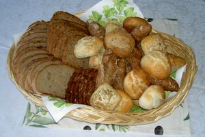 В отличие от других стран Европы, где преобладает пшеничный хлеб, в Германии чаще пекут хлеб из ржи и полбы, которые лучше произрастают в климатических условиях Германии. Кроме того, хлеб из кислого теста на ржаной или полбяной муке более питателен, чем пшеничный. В Вестфалии по особой технологии пекут на паровой бане клейкий и сладковатый чёрный хлеб пумперникель из ржаной муки грубого помола с добавлением шрота и неразмолотых зёрен[468]. Ржаной хлеб — исторически северогерманская традиция: чем дальше на юг, тем светлее был хлеб. Белый хлеб был дорогим и годился только для «французских неженок». Чёрный хлеб ошибочно считают исконно немецким изобретением, хотя он появился в Германии на излёте XIX века вместе с движением по реформированию уклада жизни, но позднее при гитлеровском режиме пропагандировался как полезный для населения продукт Имперским комитетом по цельнозерновому хлебу. Нацисты считали цельнозерновой хлеб подходящей основой питания господствующей расы и планировали довести долю его потребления до трети[458][469]. Различные сорта хлеба из ржаной муки или в смеси с другим видом муки составляют 36 процентов хлебного ассортимента Германии. Из пшеничной муки или в смеси с другим видом муки выпекается 28,8 % немецкого хлеба, 17,3 % составляют сорта цельнозернового хлеба, 8,9 % — из трёх видов муки и 5,7 % — из полбяной муки[470]. Немцы — фанаты серого хлеба, каждая третья буханка, проданная в Германии, — ржано-пшеничный хлеб. Доли тех, кто ест только белый или только чёрный хлеб, составляют в Германии соответственно по пять процентов[458]. По данным за 2013—2015 годы немецкие домохозяйства тратили в булочной 8 % своего бюджета на питание[471].