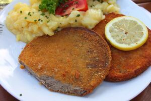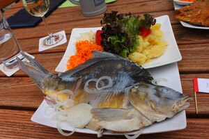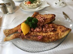 Немаловажное значение в немецкой рыбной кухне имела и другая морская рыба — треска, ценившаяся ещё со времён викингов в пресно-сушёном виде. В романе Г. Грасса «Камбала» епископ любил вкусить легендарный постный рыбный суп из «пяти пучеглазых голов балтийской трески», которые отваривали с янтарными бусами. Мелкая балтийская треска была дешёвым и доступным продуктом, обычно её томили на малом огне с белым вином, в конце в бульон добавляли огурцы и укроп и посыпали креветочным мясом. Самое типичное немецкое блюдо из трески — в горчичном соусе. В Передней Померании и в особенности на острове Рюген в мае, после сельди, наступает сезон местного деликатеса «майской рыбы», «рыбы-рога» или «рогатой щуки» — саргана, его тоже коптят и жарят. Сарган запоминается приезжим необычным зеленовато-голубоватым цветом костей, в которых откладывается биливердин, продукт разложения гемоглобина, а по местной легенде это просто бог создавал саргана в нетрезвом состоянии[173][174]. На май на Северном море приходится и сезон молодой «майской камбалы», и самым популярным рецептом её приготовления является гамбургский — по-финкенвердерски, жаркой или запеканием со шпигом[175][176]. В немецкой гастрономии понятия «жареная» (нем. Bratfisch) и «запечённая рыба» (нем. Backfisch) во многом синонимичны, подразумевая термическую обработку в горячем масле или жиру[177], и разграничиваются скорее наличием панировки или кляра[178][179], чем методом приготовления — на сковороде или в духовом шкафу. В панировке обычно зажаривают целиком мелкую рыбку, и поэтому «бакфиш» в переносном смысле означает также «девочка-тинейджер». По сведениям Д. С. Лихачёва, к началу XX века это немецкое слово бытовало в среде петербургской полусветской молодёжи для обозначения девочек-подростков, «становящихся барышнями»[180].