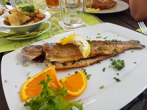 Главным источником речной рыбы в Германии был Рейн. Рейнского лосося живьём развозили во все уголки страны и потрошили уже на рынках. Швабское море знаменито своими деликатесными сигами, которые упоминались в городском уставе тирольского Больцано ещё в 1437 году. Боденских сигов жарят, готовят на пару и коптят. Рекордный вылов 1200 тонн сигов из Боденского озера зафиксирован в 1977 году в экологически неблагоприятной обстановке на пике концентрации фосфора из сточных вод, спускаемых в озеро, который вызывал неконтролируемый рост планктона[181]. Благодаря появлению более эффективных очистительных установок вода в Боденском озере стала чище, а популяция сигов значительно меньше, и в 2020 году было выловлено лишь 200 тонн. Рыболовство на Боденском озере находится в упадке, имеются проекты искусственного разведения сигов, а туристов зачастую угощают импортной рыбой[182][183]. Фаворитом немецких блюд из речной рыбы является жареная ручьевая форель по-мельничихински[172]. Кумжа и завезённая из США радужная форель, выращиваемые в богатых кислородом прохладных водах горных ручьёв, рек и озёр Шварцвальда, с 2012 года имеют защищённое географическое указание в ЕС. Рыбоводство в Шварцвальде стало развиваться с конца XIX века, когда истощились естественные ресурсы. В долину баденского Эльца не раз приезжал ловить форель страстный рыболов Э. Хемингуэй. Он рыбачил контрабандой и потому всегда держал наготове долларовые купюры, чтобы откупиться от рыбоводов. Шварцвальдскую форель не только жарят и запекают, но и коптят на буковых и ольховых дровах, она особенно вкусна с пылу с жару, остывшую копчёную форель в Шварцвальде перед употреблением принято разогревать в духовом шкафу, чтобы полностью раскрылся аромат[184][185]. На севере Германии традиционно коптят угря[186]. Жареный или запечённый карп — типичное рождественское блюдо, его продажи в это время составляют 60 % годового объёма[187]. Разведение карпов в прудах знакомо немцам издавна: известно, что ещё в 1339 году Тевтонский орден заложил многочисленные карповые пруды под Мариенбургом[188]. Карпа, а также угря, щуку и линя также варят «голубыми» с уксусом, судака в Германии готовят на маринованной с вином капусте, а из щуки в Бадене готовят клёцки под сливочным соусом. Типичное рыбное блюдо в берлинской кухне — отварной хафельский речной угорь в зелёном шпревальдском соусе[189].