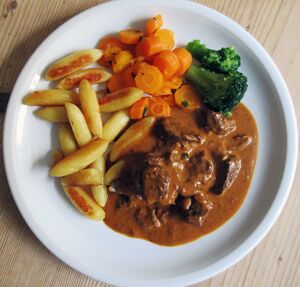 Олений гуляш с шупфнуделями и разжаренными на сливочном масле отварными овощами |
