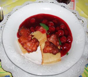 Современные сладкие блюда давно перешагнули национальные границы, и у многих блюд уже сложно определить регион их происхождения. Типично немецкими десертами остаются густой ягодный кисель роте грютце и похожий на бланманже пудинг, ванильный или шоколадный. Для трансформирования английского чёрного пудинга в современный немецкий молочный десерт потребовалось несколько столетий. Первый немецкий пудинг в 1683 году представлял собой ещё мясные клёцки, приготавливаемые на пару в салфетке. Предшественниками ныне несколько старомодного немецкого десертного пудинга были затем солёные мучные пудинги под названием «английские клёцки», которые появились на Севере Германии в начале XVIII века. Пудинг стал в Германии сладким с распространением свекловичного сахара[511]. Компания Dr. Oetker производит порошковые пудинги для заваривания в молоке с сахаром с 1894 года, и самым первым из них стал ванильный пудинг[512]. Шоколадные пудинги, выпускаемые в Dr. Oetker, адаптированы для сбыта в 26 странах мира, и по их данным немецкий шоколадный пудинг, к примеру, менее сладкий, чем турецкий, и лучше дрожит, чем польский[513]. Готовые к употреблению пудинги в широком ассортименте предлагают немецкие супермаркеты. В Мюнстерланде классическим десертом признан «господский крем» — смесь ванильного пудинга со взбитыми сливками, шоколадной стружкой и ромом, который любят и дамы[514]. Стабилизированный желатином десертный сливочный баварский крем обрёл популярность за пределами малой родины[515], ещё в XIV веке добравшись до французского двора к бракосочетанию баварской принцессы Елизаветы с королём Карлом VI[516]. В Нижней Саксонии национальным считается десерт Вельфов — комбинация из нежнейшего молочно-ванильного и винного кремов в тон бело-жёлтому гербу монаршей династии[517]. Из вчерашнего белого хлеба на юге Германии готовят традиционные горячие десерты — запеканки «вишнёвый Михель» и «костёр» — с вишней и яблоком соответственно[518]. Сладкая выпечка во фритюре — пончики, в том числе берлинские, а также рейнские мутцены или швабские нонненфюрцле — традиционный десерт на карнавале[519][520]. Со Средних веков повелось, что последний раз забить свинью до начала поста разрешалось не позднее Грязного четверга. И чтобы свиной жир не пропал, на нём жарили разные изделия из теста[521]. Жаренные во фритюре яблочные колечки в тесте называются «яблочными пирожками», фаршированные изюмом или орехами цельные яблоки «в шлафроке» из теста запекают в духовом шкафу[522]. Яблочные оладьи по-рейнски были любимым блюдом канцлера Конрада Аденауэра, которые он умело готовил сам[523]. Классическими фруктовыми десертами являются апфельмус и компот, под последним подразумеваются отваренные фрукты в десертной розетке, а не напиток в стакане[524].