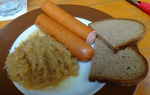 Подогретая городская колбаса с квашеной капустой и серым хлебом в байройтской пивной |