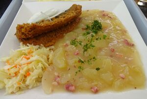 В Германии сертифицировано более двухсот сортов картофеля[220]. Около половины немецких домохозяйств предпочитают такие слегка разваривающиеся сорта, как «гала» или «агрия», а также неразваривающиеся, как «белана», и готовят из них картофельные гарниры, салаты и добавляют в супы. Почищенный и порезанный на куски картофель, сваренный в подсоленной воде, называется у немцев не отварным, а «солёным» (нем. Salzkartoffel)[222]. Немецкие хозяйки часто отваривали картофель чищеным или в мундире накануне, и на следующий день при обжарке у них получались в зависимости от добавленной пряности картофель с укропом[223], картофель с петрушкой[224] или картофель с тмином[225] на гарнир. Картофельный салат — популярный гарнир к любому блюду[226]. В Швабии картофельный салат готовят из ещё горячего отварного картофеля с рубленым репчатым луком и заправляют не майонезом, а горячим мясным бульоном с растительным маслом и уксусом и едят полутёплым[211]. Рассыпчатые сорта картофеля с большим содержанием крахмала, как «аманда» или «карлена», которые приобретают только 10 % немцев, идут на пюре, крокеты, клёцки, оладьи и запеканки[227]. С начинкой из картофеля с луком и пряностями готовят картофельный штрудель[228]. На юге Германии готовят картофельную колбасу[229] и картофельный сыр[230]. Самое любимое блюдо немцев — жареный картофель — готовят со шпигом и репчатым луком как из сырых клубней, так и из предварительно отваренных в мундире[231]. В любом из этих вариантов жареный картофель должен быть обязательно хрустящим, с румяной корочкой[232][233][234]. Жареный картофель — настолько привычная для немцев еда, что в голодные годы Первой мировой неперспективные внебрачные отношения, в которые вступал немецкий мужчина ради регулярного горячего обеда, назвали «отношениями на жареной картошке» (нем. Bratkartoffelverhältnis)[235]. Из обжаренного картофеля с яйцом и остатков жаркого рачительные немцы готовят крестьянский завтрак и хоппель-поппель[228]. Тёртый отваренный картофель, смешанный с мукой и иногда яйцом и обжаренный на растительном или топлёном масле, называется картофельшмаррн и подаётся гарниром к мясным блюдам в Нижней Баварии и Верхнем Пфальце. Картофельные оладьи в Германии готовят с репчатым луком и подают со сладким густым яблочным муссом, яблочной пастой или квашеной капустой[236][237]. По реке Майн проходит так называемый «экватор клёцек», южнее которого, как считается, и проживают их любители[238]. Немецкие картофельные клёцки или кнедли помимо этих двух основных равноправных названий имеют в Тюрингии, Саксонии и Франконии региональные варианты «хютес», «хебес», «кнёлла», «глеес»; их готовят из тёртого сырого и отваренного накануне картофеля в разных пропорциях по строго прописанным правилам[207]. Чем больше в тесте картофеля, тем нежнее и мягче получаются клёцки[239]. Тесто для больших тюрингенских клёцек-шаров на две трети состоит из сырого тёртого и отжатого картофеля и одной трети размятого отварного картофеля, а сами клёцки начиняют обжаренными на сливочном масле кубиками белого хлеба и томят в течение 20 минут в подсоленном кипятке. В тесто для клёцек из тёртого отварного картофеля добавляют муку и яйца. В охотничьих клёцках к тёртому отварной картофель дополняют мелко рубленные лисички, тёртый репчатый лук и петрушку[240]. Помимо картофельных, клёцки в Германии готовят мучны